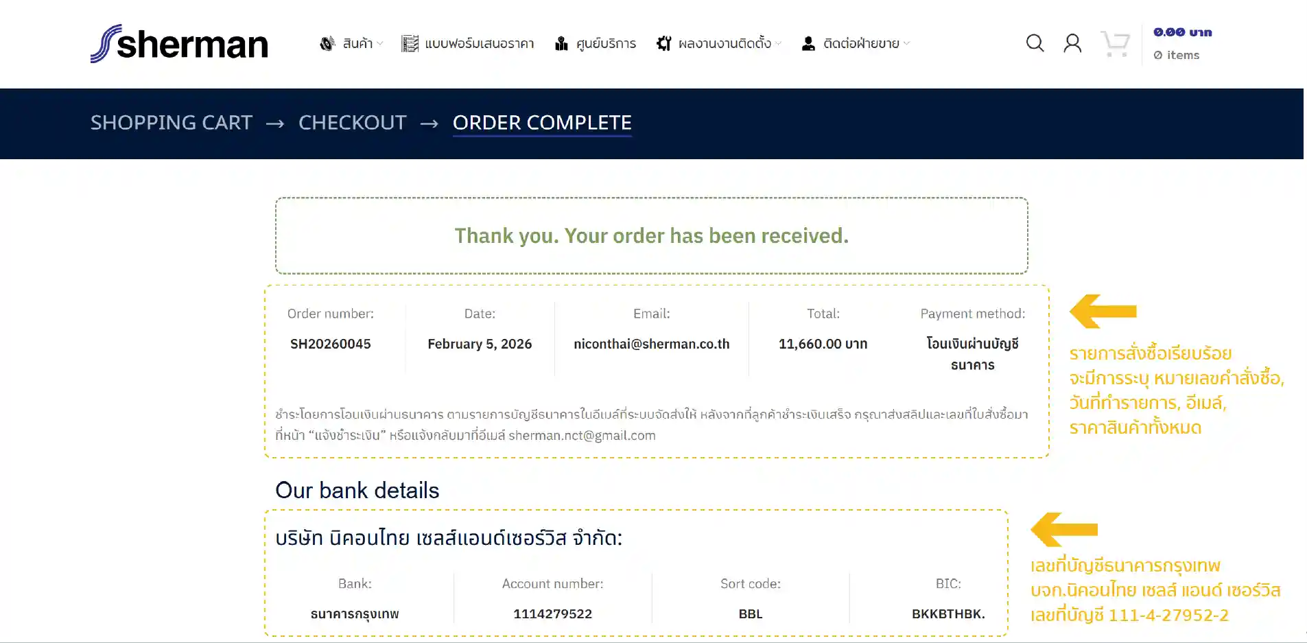 การชำระเงินผ่านบัญชีธนาคาร สะดวกและรวดเร็ว ลูกค้าสามารถชำระเงินผ่านบัญชีธนาคารของบริษัทได้โดยตรง หลังจากชำระเงินแล้ว สามารถส่งหลักฐานการโอนเงินมาที่อีเมล์ sales@sherman.co.th หรือคลิกลิงค์ แจ้งการชำระเงิน