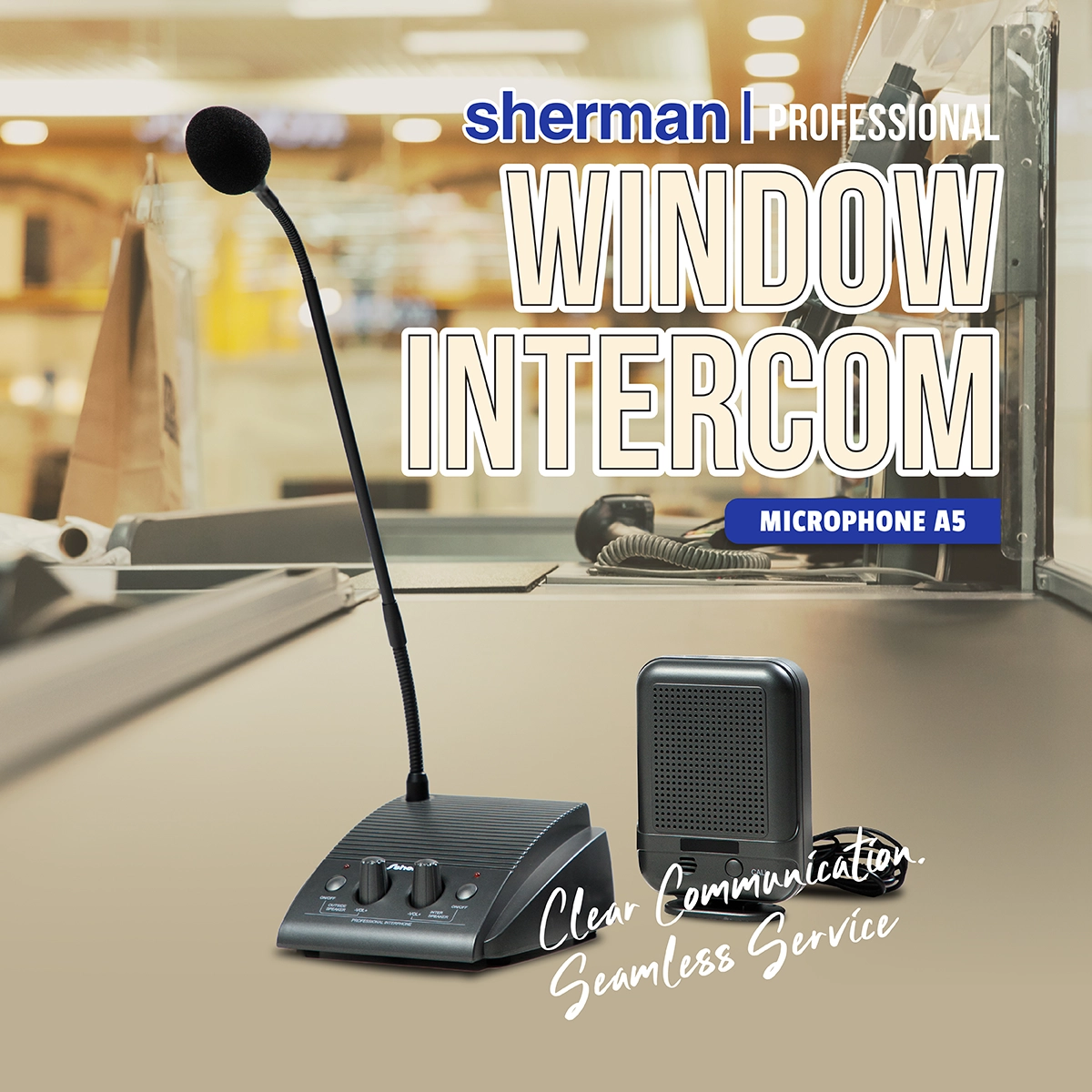 SHERMAN A5 ไมโครโฟนอินเตอร์คอมพร้อมลำโพงแบบตั้งโต๊ะ คุณภาพสูงที่ออกแบบมาเพื่อลดอุปสรรคในการสื่อสารผ่านกระจกหรือฉากกั้น ให้เสียงพูดที่ใสสะอาด ลดเสียงรบกวน และติดตั้งง่าย เหมาะสำหรับเคาน์เตอร์บริการทุกรูปแบบ